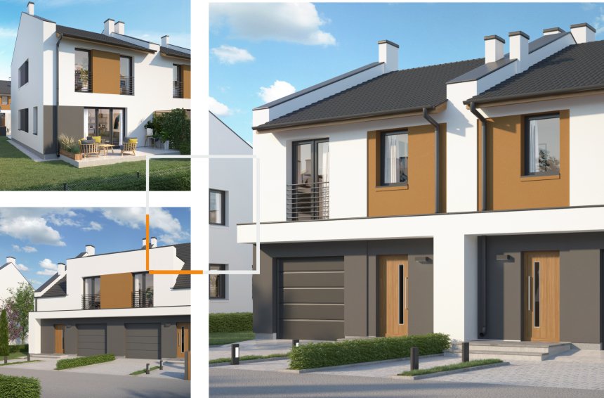 Osiedle "Luxury Living". Domy jednorodzinne na sprzedaż z działką i garażem w zabudowie bliźniaczej. Dom z poddaszem o łącznej powierzchni mieszkalnej 124 m². Dwie kondygnacje. Piętro w pełnej wysokości. Dom niepodpiwniczony. Stan deweloperski z pompą ciepła i fotowoltaiką. Oferta dla osób ceniących ciszę i spokój oraz możliwości, jakie daje położenie osiedla w otoczeniu natury.